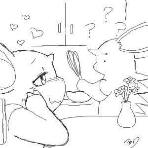 She thinks of Nidorino on a daily basis, because she cares a great deal about him and his well being. She's always excited to receive a phone call or see him via webcam (unless the reason for contact is bad news). Nidorino doesn't fully appreciate Nidorina's love for him and just how fortunate a husband he is until late in the series. All the little things, and the big things... everything counts. She always made sure he knew she loved him, there's never a promise of tomorrow, after all. All marriages could at least learn from this. So in this picture, Nidorino tries to show his appreciation by making her breakfast, but is absolutely stumped on what a whisk is or does. The meal WILL end in catastrophe, and she knows this. But you know what? She loves him just for the thought.