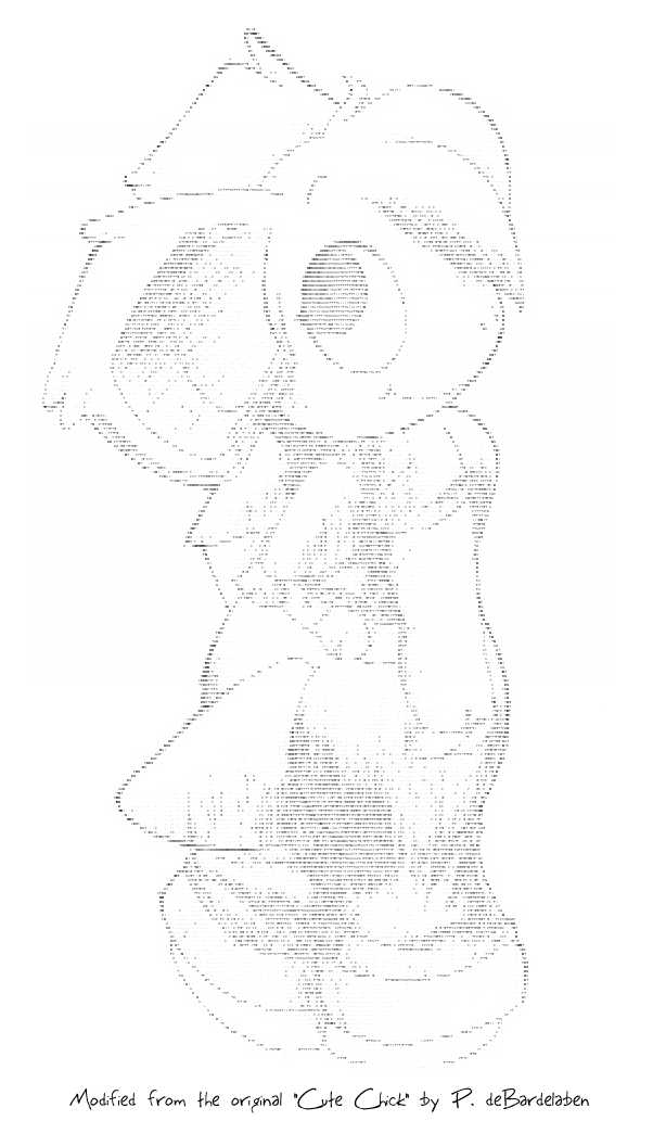 It's Cute Chick, one of my favorite works, but done completely with typed characters. The original is huge, and I had to scale it down for the purposes of upload requirements. It makes it that much harder to tell that it's made from text, but take my word for it. I guess you could say that words were used to define exactly what a cute chick is, besides being a term that's not entirely PC.