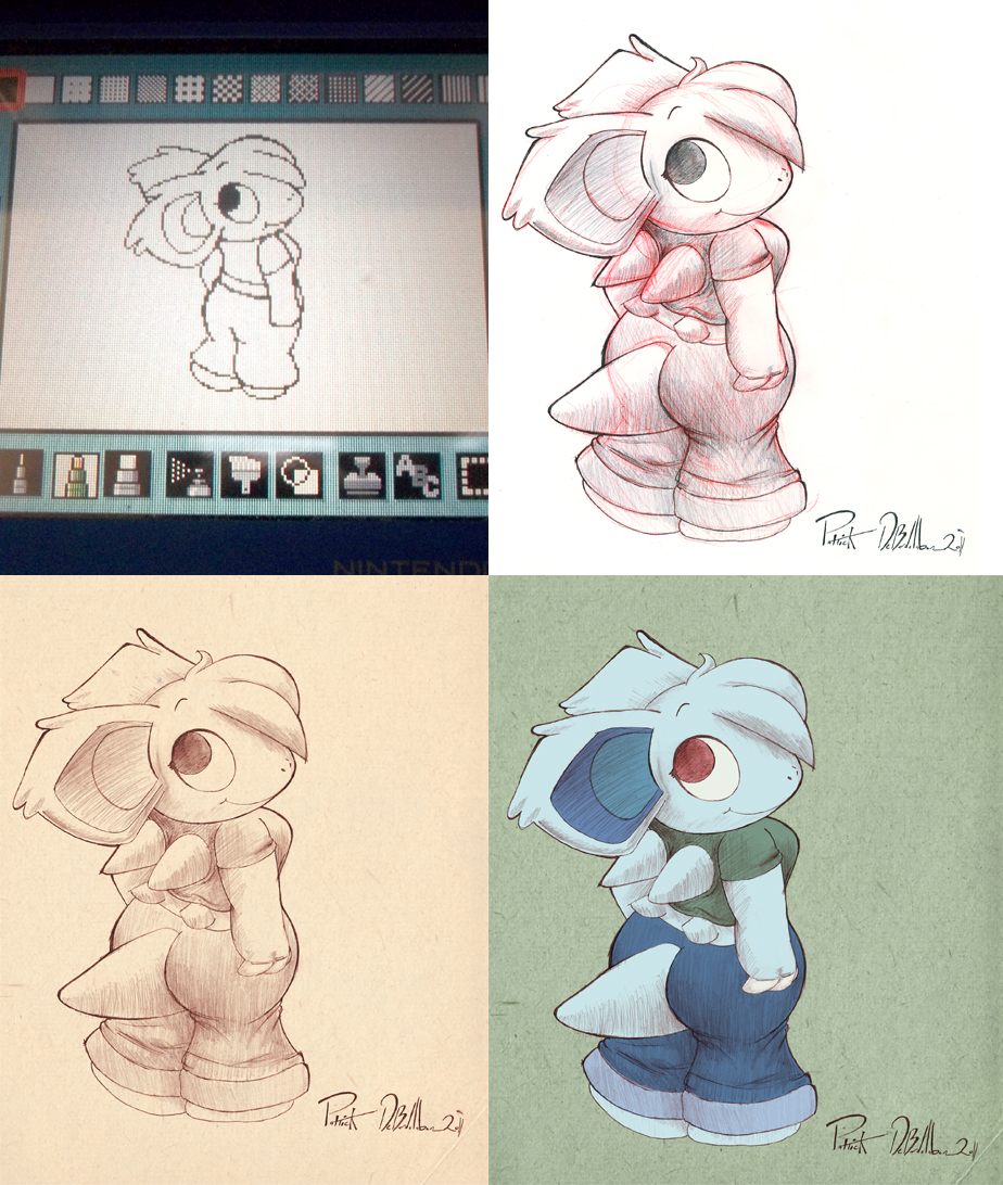 While working on this piece, I really liked the way the work looked at different stages, so I saved them and put it together here so you can have a look too. True story: While the concept of this picture was in my head all week, I finally thumbnailed it out it on my DS while waiting to get a haircut. You can't tell me portable gaming devices don't have a use. The construction version adds the tail and spikes (among other details). Doing so required me to close off the pant crease, so her butt looks big in the rough draft (not that it isn't otherwise). I will admit I was going for tight-waisted jeans to fit around her hips, as shown in the DS concept.