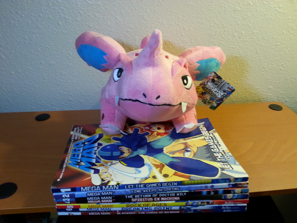 If you'll excuse the Mega Man paperbacks, I had to prop Nidorino up with the closest, solid, not-too-intrusive thing I could get my hands on, and a stack of comics works well. Nidorino has the cutest face, my God, look at him! You know, I get that part of Nidorino's appeal is that he looks, or looked rather (back in ye olde days), kind of hectic. But if all of a sudden, henceforth this became the new design for Nidorino, I wouldn't be mad. It's on its way anyway, Nidorino no longer looks as threatening as he did in his early promo art, and Bulbasaur took a dip into the fountain of youth (or the fountain of cute, as it were. Perhaps both) itself, setting some precedent. This is also probably the closest AU Nidorino might look under an official lens, too, which says a little something about his softer design.