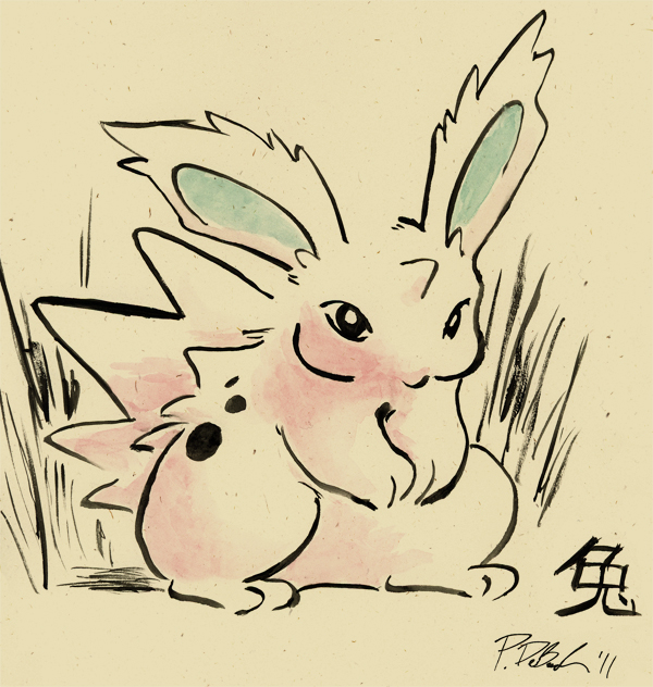 Influenced by sumi-e. Okay, so I didn't use any ink, and there's some color, but I did use watercolors (the kind in the tube, not the cakes). Took a few tries, but I ended up with this version which I like the most. To me, it took far less time than anything digital would have. The brush strokes just wouldn't've been the same if I tried this in Photoshop. Anyway, happy Year of the Nidoran. Uh, Rabbit. Same difference.