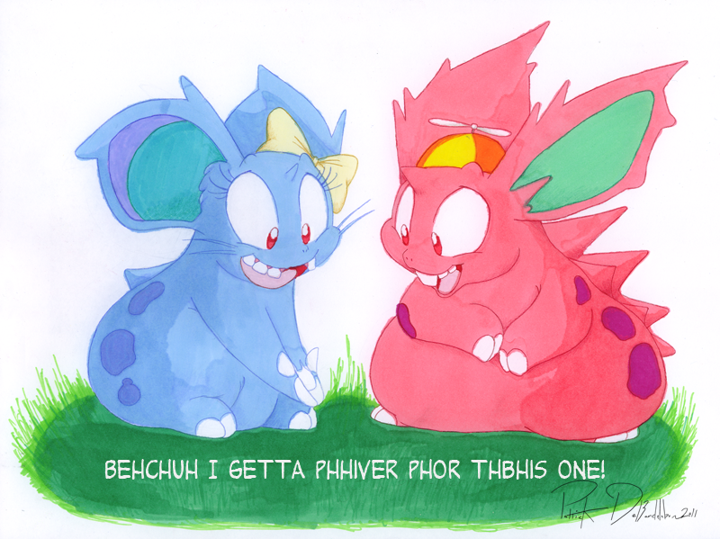 Had this idea in the holster for a while now, existing as a thumbnail drawing. Drawn with pencil, colored with Prismacolor markers and colored pencils, outlined with colored pencil. And I dunno why, but when drawing the boy, all I could think of was Skippy Squirrel (Animaniacs). No references to anything were used, though, except for the thumbnail (which looked roughly the same in style).
