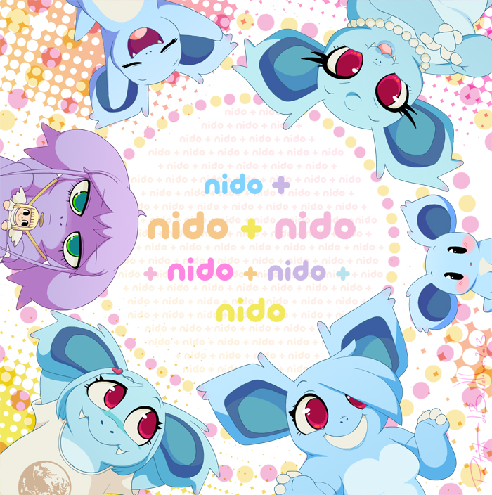 It appears that these days, "The Big Three" have become "The Big Six", and I'll most likely cap it here. Nevertheless, Aqua Bunny wouldn't be half as interesting without the contributions of these characters in whatever entertainment medium they best reside in (and what they've inspired in other fans to create for themselves). In fact, I wouldn't run this site (STILL) if it was purely a site for Pocket-men facts and figures. I have a lot of fun with these Nidorina, but that's no slight towards the other family members (the everyman Nidorino, the other loafer Nidorino, and Ms. Nakamura, a pleasant but busy bee of a Nidoqueen to name a few). In appreciation of these characters, here's a bright, candy colored pic for you, full of happy smiling Nidorina (Charlotte's not unhappy...)