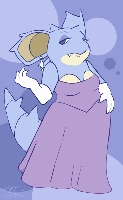 Last of the stylized Nido femmes. This style of art really fits this character, being that she's all about elegance. I could have given her ornate clothes, but the idea was just to keep it simple, after all, I was just playing with the style, I wasn't planning on showing this off professionally. She looks like she has a snooty looks-down-on-others expression/posture. Despite being rich, that's not in her character normally, but you must admit it just works here. I wonder how she makes other Nidoqueen feel? She also looks like she doesn't even NEED other people's business. I can't imagine going to a dinner party myself, but I get the feeling by not over dressing, she'll end up with all eyes on her. "Oh gracious! What's to be done about that Nidoqueen?"
