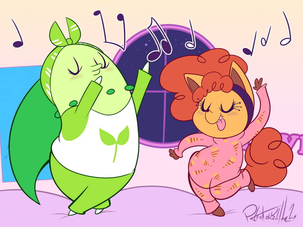 I wanted to do something less “kawaii” and more kinetic and fun, so here I am, just like these two, still awake long past the point where I should be.