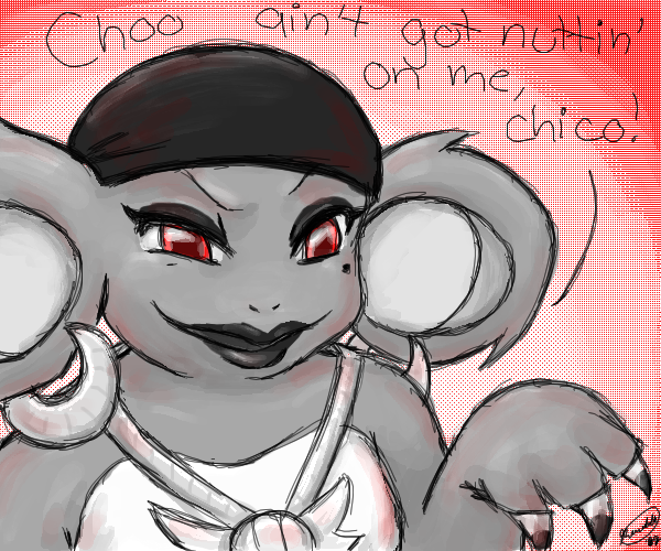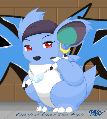 As an interesting note, this doodle would set the standard of how Carmela should appear henceforth. Sure, adding clothes puts her on that fence of being a morph which I don't like, but it couldn't be more fitting for her character so it stays. Plus, without the clothes she'd look like any other Nidorina so it's all good.