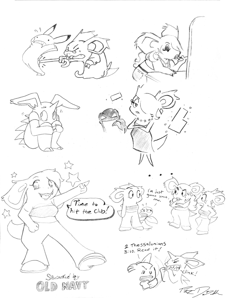 Some more Nidos, this time including some lesser seen ones. Adding Reilina to the mix of Carmela and Nidorina makes for a nice three way hate-triangle. Oh yeah, I'm totally gonna run with that Old Navy sponsor idea in the future. You know, I was watching a bunch of late 1950's commericals one day, and I got to thinking, why don't we use animated characters to sponsor our products anymore? Where'd all the fun go? Now instead there's a bunch of commercials revolving around people working at dead end desk jobs, usually with a trio with at least one quirky guy, and the overuse of the phrase "awkward". What's awkward is how anybody could see that as entertainment. I'd love to sponsor a product with a cartoon character, with something catchy and fun so you'd actually remember it next time you went to the store. Heck, maybe I'll start looking into side work for it, things need to change around here.