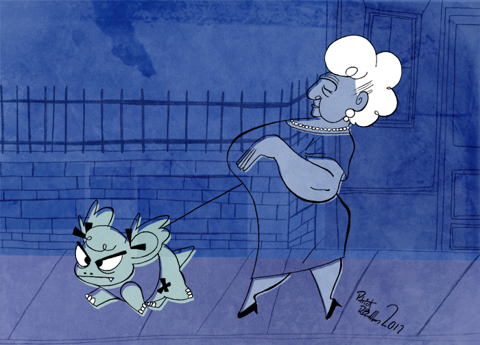 I've been sitting on this picture for years, it was to go with all the other remakes/reimaginings (Snow Bunny '08, New Years '10, etc). Same concept, better execution. The old woman looks way better than my years old concept sketch. Also, there is a such thing as a rabbit harness, for those of you who don't own one.