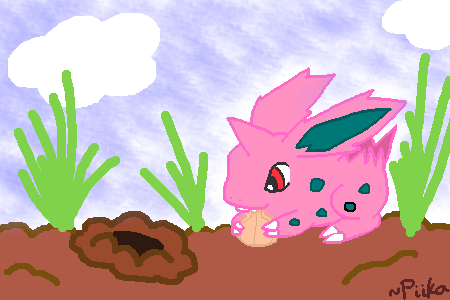 I tried a new style and a new Pokemon today! Little Nidoran found an onion in his neighbor's garden today. He seems to like it! ^_^