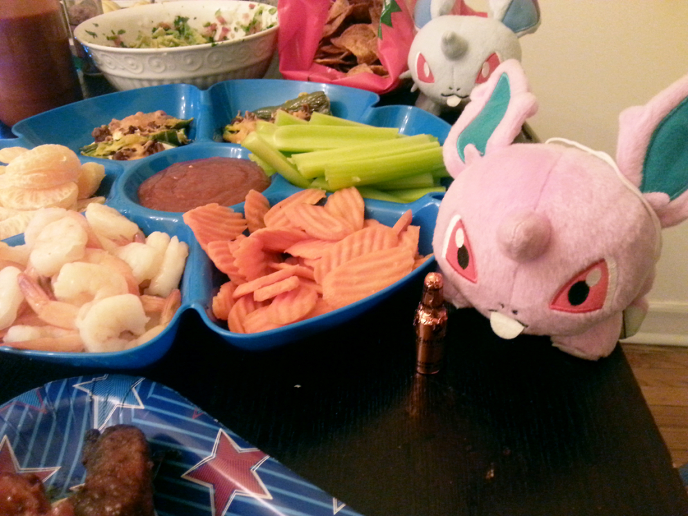 Here we have a tray of shrimp, clementine slices, jalapeno poppers, celery and carrots. Hey, what's that you have there, Nidoran? I think you might be a little young for that, don't you?
