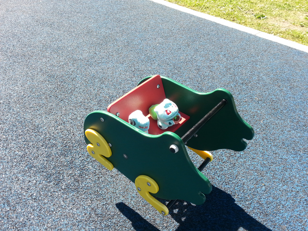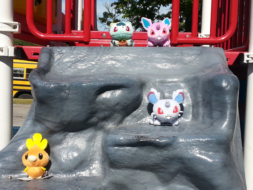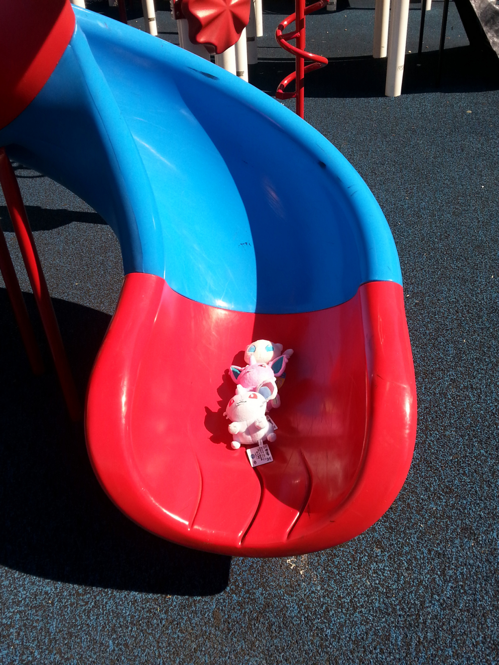 Both Nidoran and Mew slide down the corkscrew slide together. Nidoran seems to have had a really fun day, today. I wonder if they'll have another get together sometime?