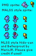 A sprite sheet of Nido-san and Bellsprout in MALSS style.