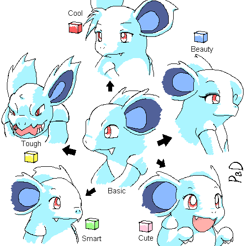 Variations art BEFORE it was cool. :P According to Pokemon Ruby/Sapphire, a Pokeblock changes the features of a Pokemon. I question the ethics of DNA manipulation (and the trainers who mindlessly endorse it), but I drew what I figured Nidorina might look like under moderate consumption of Pokeblocks for each category. That said, because of physical change by Pokeblock, no one is ever allowed to say Nidorina (or any other Pokemon) couldn't look better or worse, realistically (in a fantasy world).