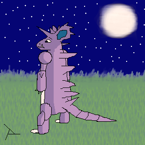 Nidoking is thinking back on the days when he was a Nidoran... when he was taken care of and mothered. Now he's an adult and has to take care of himself, but he still just wants to be loved.