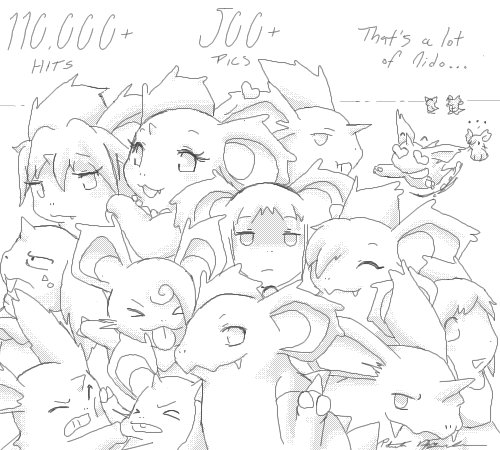 When this pic was made, I had over 500 pics and 110,000 hits. Pretty nice still considering this is a Nido site. Ugh, basic Nidorina's arm looks strange. This picture includes a lot of characters who were around at the time. Assuming you already know which characters are mine, from the top left going clockwise there's Achikochi, Brett, Kagome, Puck and Fwoozles. Moffie is in the background being anti-social, Nidoking and Queen are furthest back because they're the most under represented on this site. Nidoran M & F fight because they constantly seem to tie with each other as far as art goes.